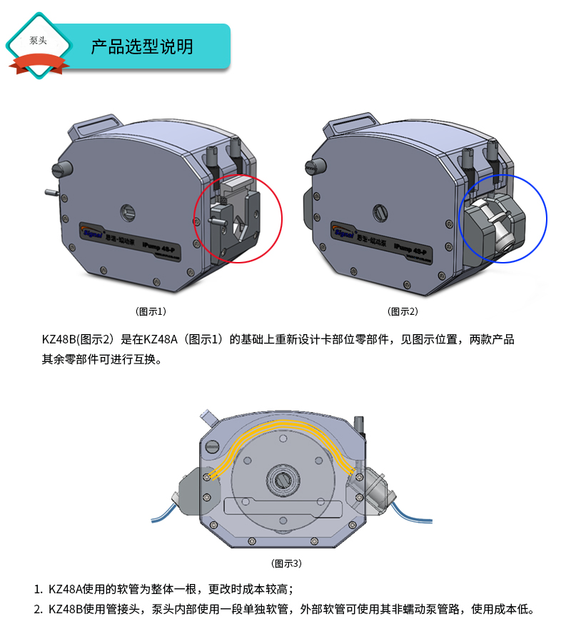 ? ? ? ? ? ?2.? KZ48B使用管接頭,泵頭內部使用一段單獨軟管,外部軟管可使用其 非蠕動泵管路,使用成本低。