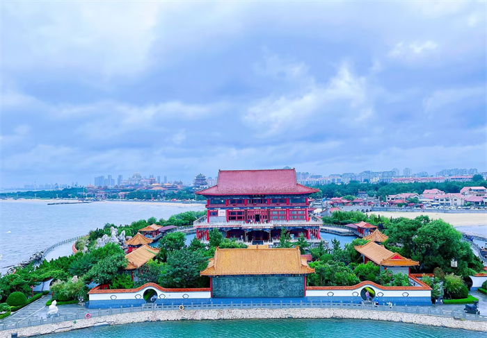 整個(gè)景區(qū)漂浮在大海上,景中有海,海中有景,內(nèi)外海水相連,點(diǎn)點(diǎn)漁帆與岸邊景色相映成趣;玉樓仙閣,祥云繚繞;亭臺(tái)軒榭,步移景異;踏圍廊幽徑,臨海國(guó)信風(fēng),聽漁歌唱晚,觀碧波靈光,詩(shī)情畫意,不勝陶然。